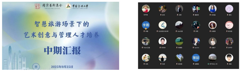 2025年9月25日上午,由国家艺术基金资助、中国传媒大学主办、文化和旅游部资源开发司指导,中国文化娱乐行业协会、杭州市西湖区古荡街道共同协办的国家艺术基金2025年度艺术人才培养资助项目《智慧旅游场景下的艺术创意与管理人才培养》中期汇报会于线上顺利召开。