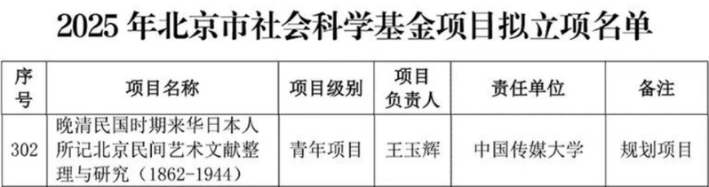 近日,北京市社科联、北京市社科规划办公布了2025年北京市社科基金项目立项结果。我院艺术史论专业方向王玉辉副教授申报的“晚清民国时期来华日本人所记北京民间艺术文献整理与研究(1862-1944)(批准号:25BJ03250)”获批立项。