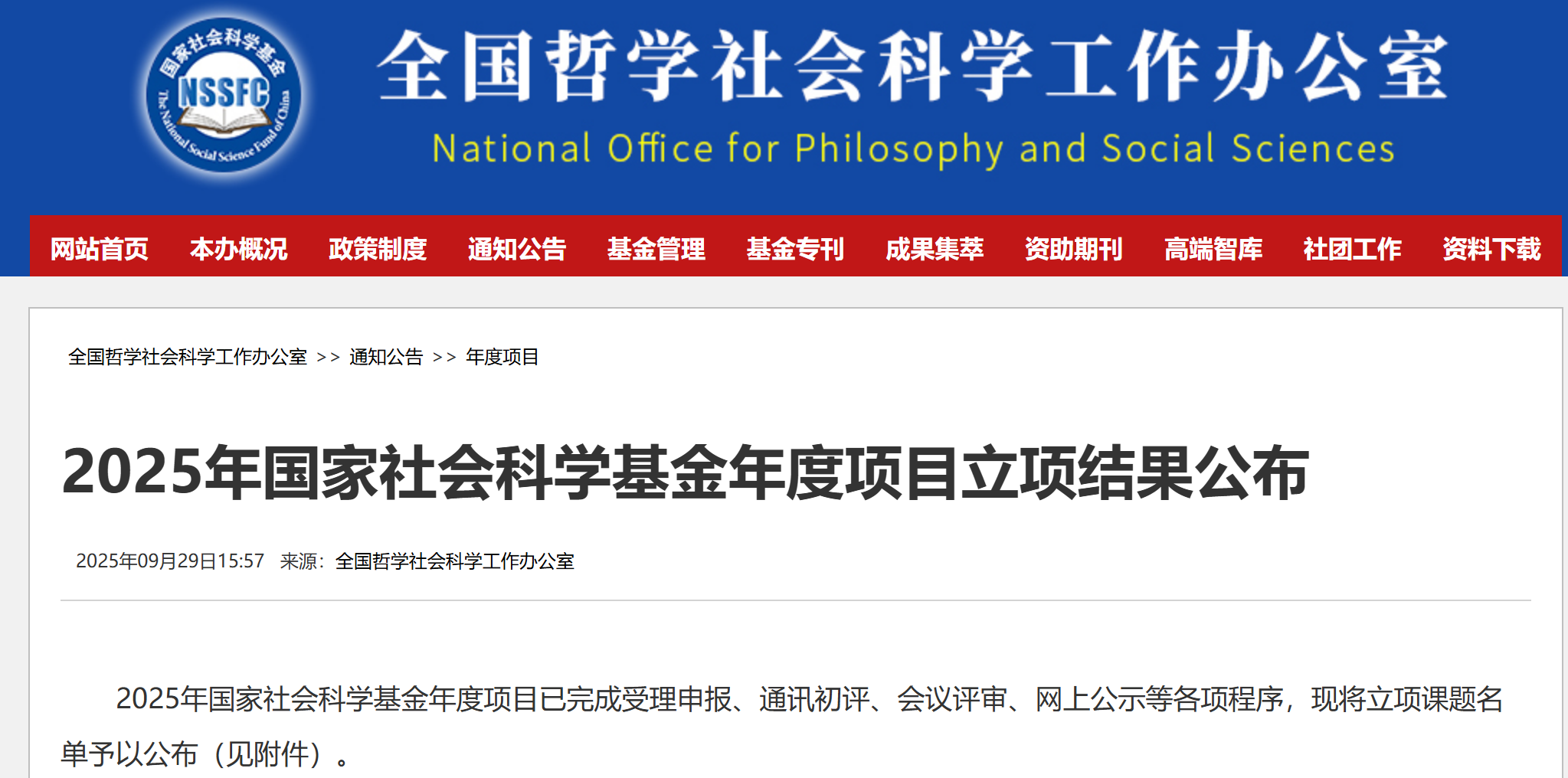 近日,全国哲学社会科学工作办公室公示了2025年度国家社科基金年度项目立项名单。我院刘静教授申报的《中国...